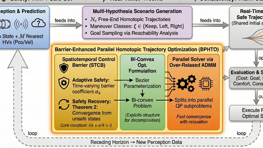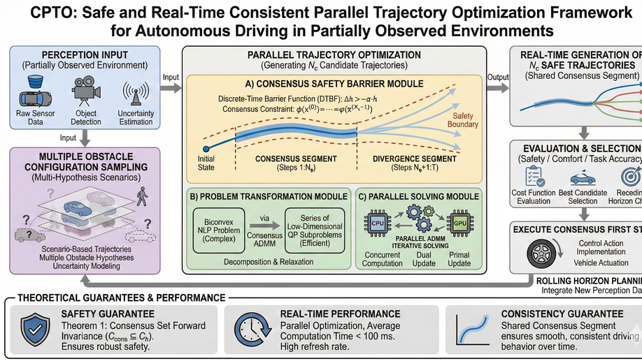 This framework introduces a consensus spatiotemporal safety barrier within a scenario tree structure to address potential hazards. Using consensus ADMM and a shared spatiotemporal safety barrier for each trajectory, the framework evaluates diverse risk configurations while enforcing motion consistency under perception uncertainty, such as sensor mis-detections. The framework is particularly effective in environments with dense obstacles in partially observable environments, enabling scalability to handle an increasing number of obstacles in large-scale, real-time optimization. We present the limitations of current parallel trajectory planning approaches, particularly their low accuracy and poor real-time performance.