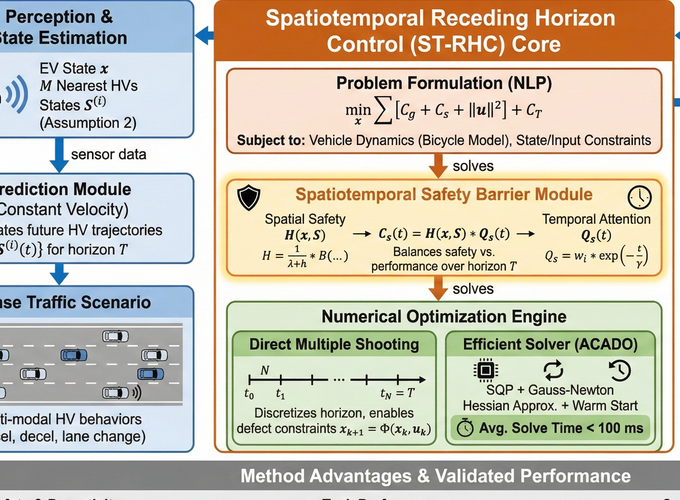 In dense traffic scenarios, ensuring safety while keeping high task performance for autonomous driving is a critical challenge. To address this problem, this paper proposes a computationally-efficient spatiotemporal receding horizon control (ST-RHC) scheme to generate a safe, dynamically feasible, energy-efficient trajectory in control space, where different driving tasks in dense traffic can be achieved with high accuracy and safety in real time. In particular, an embodied spatiotemporal safety barrier module considering proactive interactions is devised to mitigate the effects of inaccuracies resulting from the trajectory prediction of other vehicles. Subsequently, the motion planning and control problem is formulated as a constrained nonlinear optimization problem, which favorably facilitates the effective use of off-the-shelf optimization solvers in conjunction with multiple shooting. The effectiveness of the proposed ST-RHC scheme is demonstrated through comprehensive comparisons with state-of-the-art algorithms on synthetic and real-world traffic datasets under dense traffic, and the attendant outcome of superior performance in terms of accuracy, efficiency and safety is achieved.